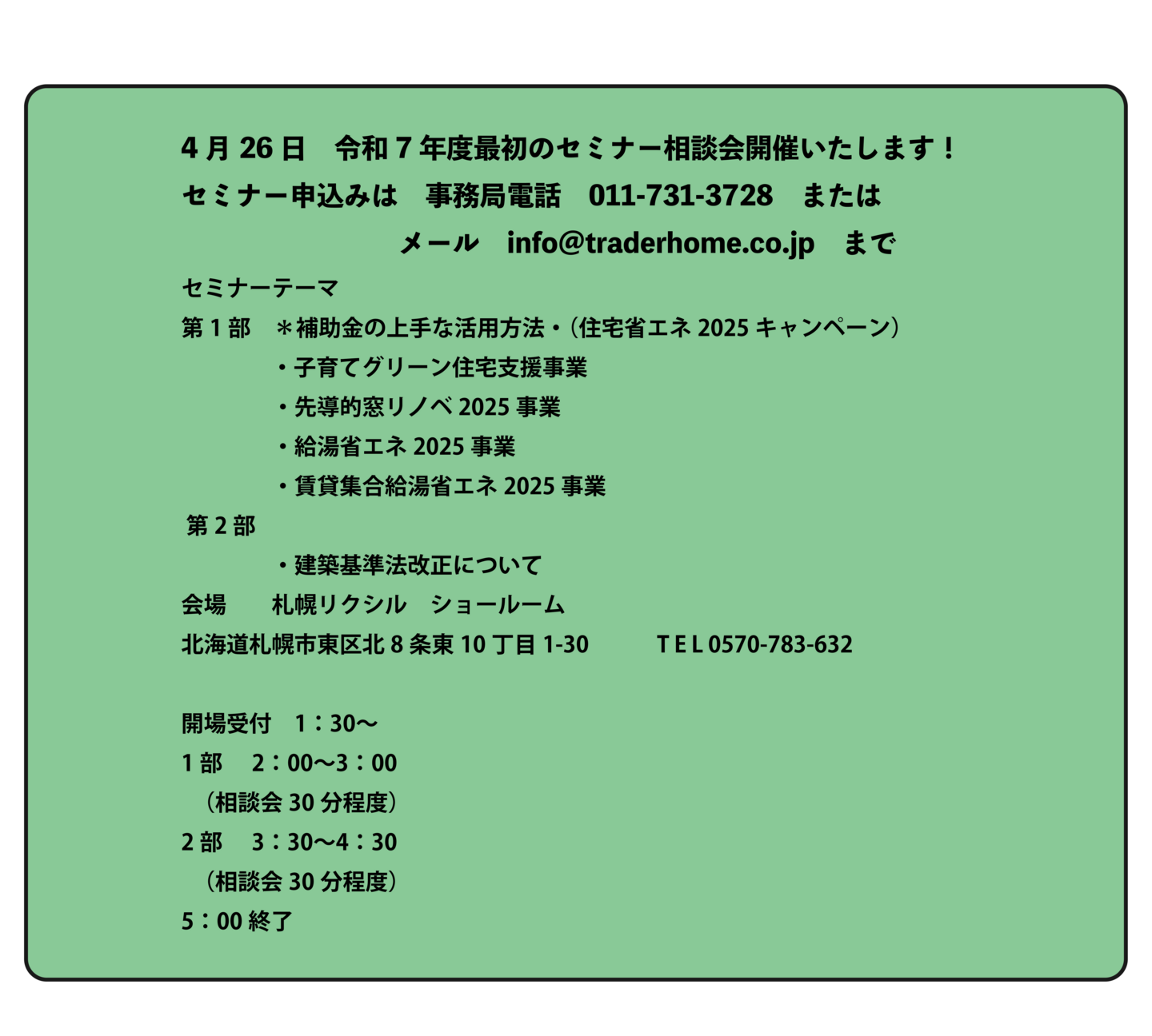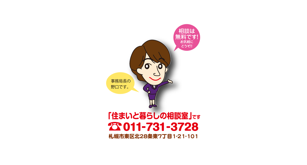 その中でも当事務局「住まいと暮らしの相談室」は事業開始初期から札幌市経済局の担当者とともに切磋琢磨しながら当事業を作り上げてきました。「女性の視点」「主婦の感性」を生かしながら、どんな相談 に対しても速やかに対応しております。安心して工事の相談や依頼がで きるよう親身になって対応し、相談者と企業との間で常に中立の立場を 心がけています。見積、工事内容も解りやすく伝わるようにサポートしま す。参画企業は確かな技術と専門知識を活かし、適切なアドバイスを行 います。相談内容を表面的に見るのではなく、見逃しや見落としがない よう原因を追及し、的確な診断や助言をいたします。